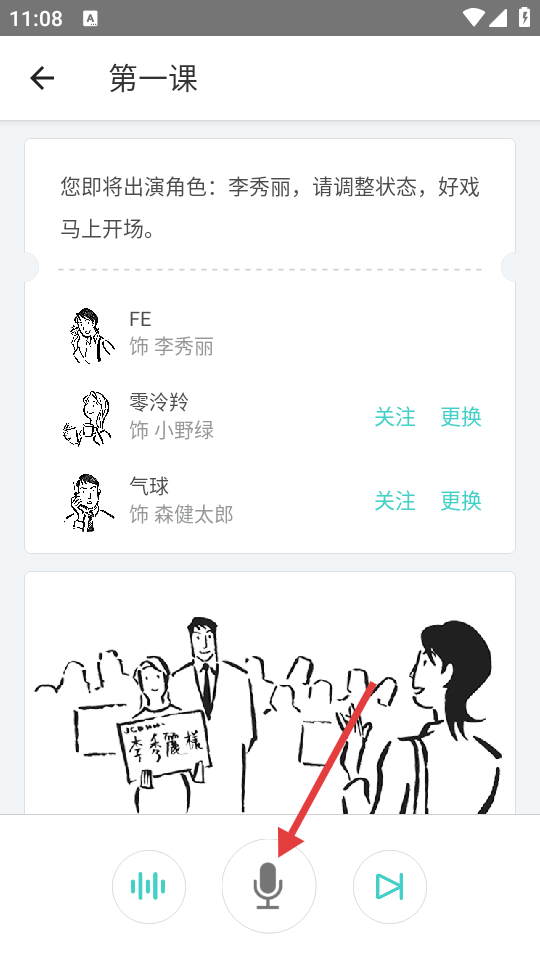 4、在角色出演准备页面,点击麦克风图标,开始进行角色配音出演。