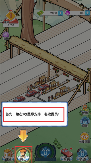 1、要给【左1收费亭】安排收费员,需点击下方【员工】按钮,进入员工管理界面开始操作。