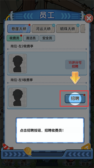 2、在员工界面的【左1收费亭】岗位下,点击【招聘】按钮,即可进入收费员招聘选择环节。