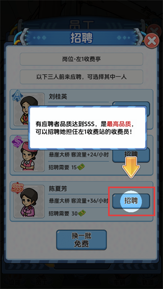 3、招聘时优先选SSS品质的应聘者,如【陈夏芳】,点击其【招聘】按钮,她能提升【悬崖大桥】客流量,助力收益增长。