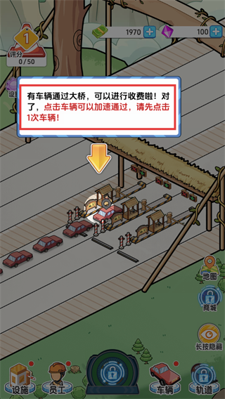 4、有车辆通过大桥时可收费,点击车辆可加速通过,按提示先点击1次车辆,提升通行效率和收益。