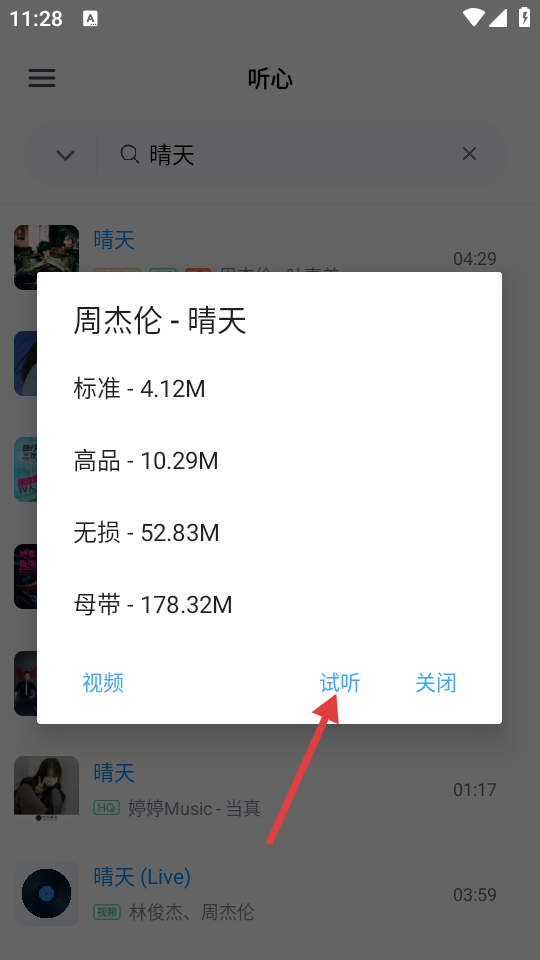 3、在弹出的音质选择框中,点击“试听”,进入歌曲试听环节。