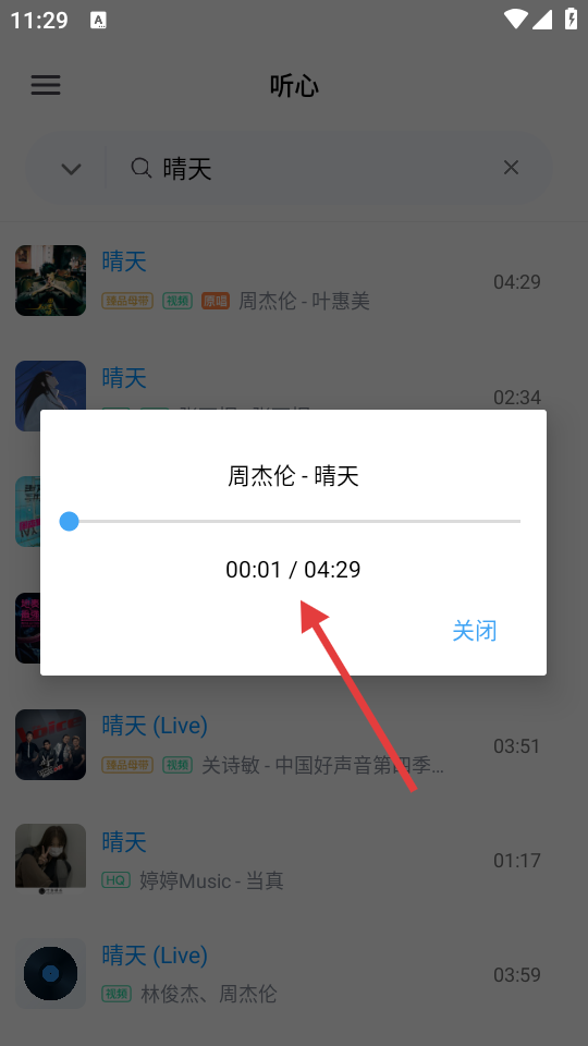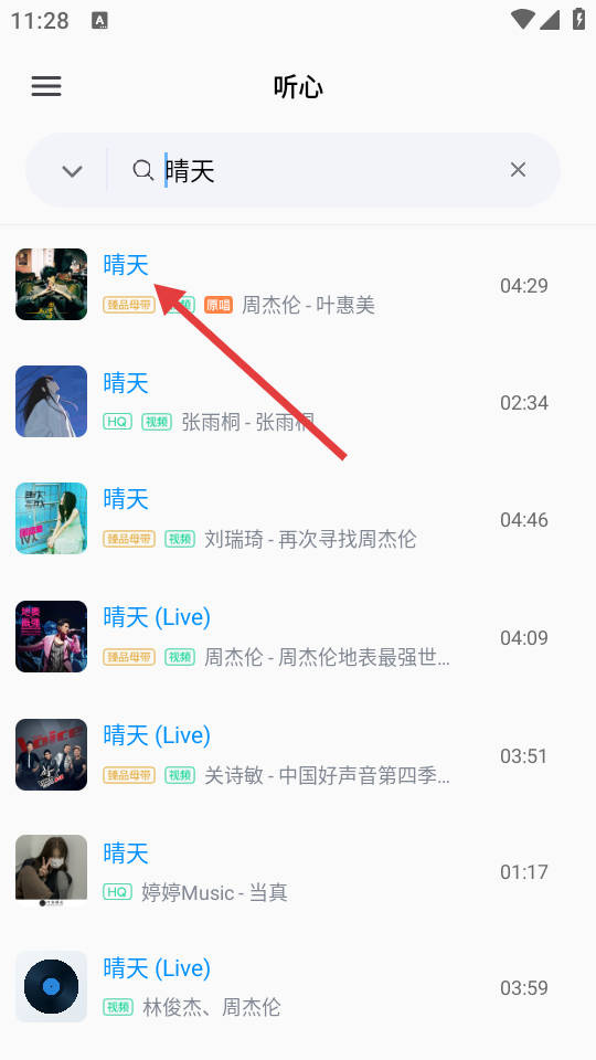 2、在搜索结果中,点击目标歌曲,如周杰伦的《晴天》。