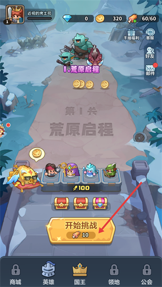 2、点击【开始挑战】进入【第1关荒原启程】,消耗10个道具即可挑战。