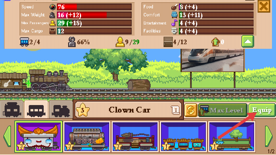 4、装备列车车厢,如小丑车厢,提升列车各项属性,优化运营效果。