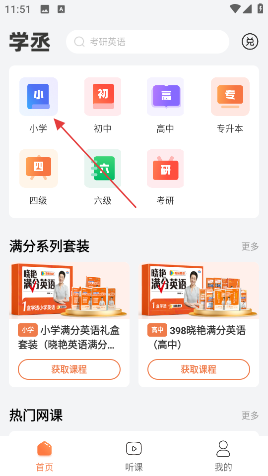 1、在【学丞】首页,点击【小学】分类,进入小学课程板块。