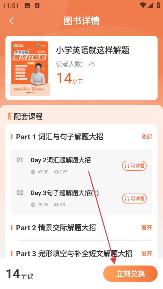 3、在【小学英语就这样解题-图书详情】页,点击【立刻兑换】按钮,进入兑换中心。