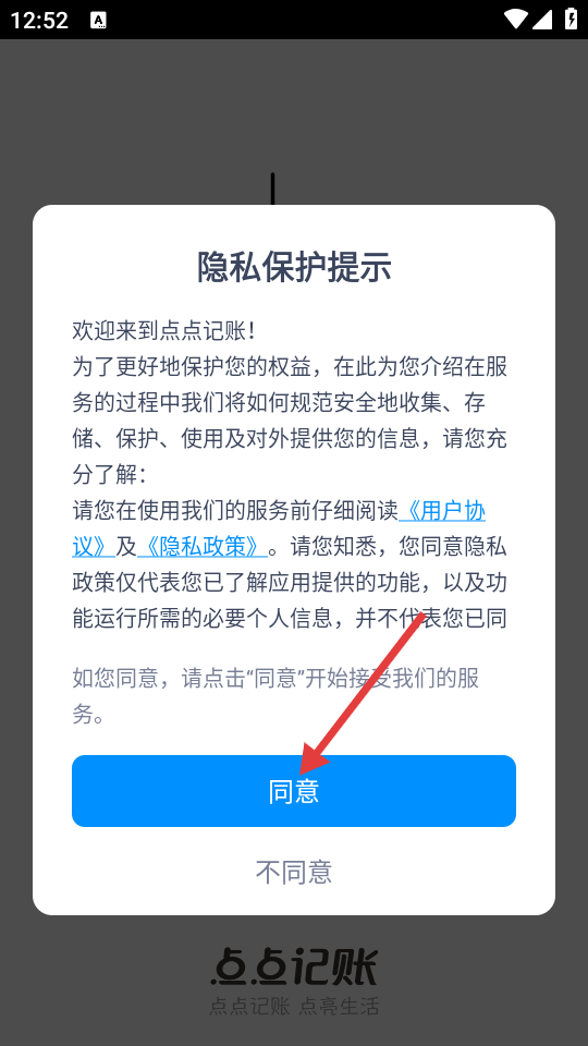 1、在隐私保护提示框中,点击“同意”,进入应用主界面。