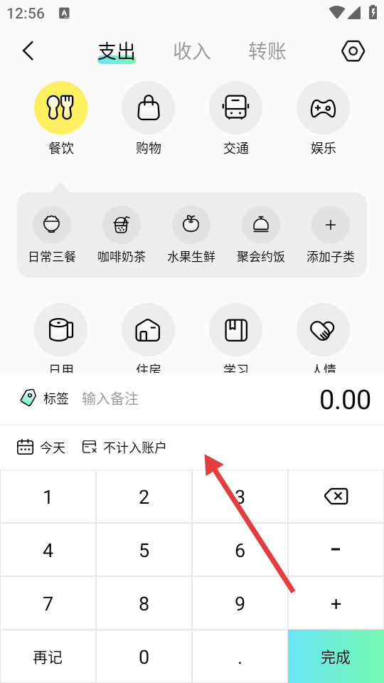 3、在记账分类选择页面,选择支出分类(如餐饮)并输入金额,完成记账信息填写。
