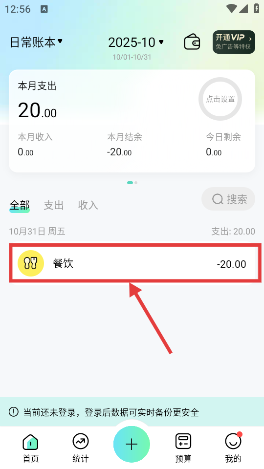 4、完成记账后,在主界面可查看本月支出等账目信息,如餐饮支出20.00元的记录。