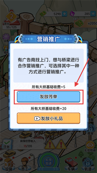 2、营销推广时,选择【发放传单】,无需观看广告即可让所有大桥基础收费加5,提升收益。