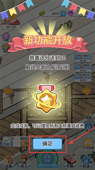 3、评分达到60解锁【成就】功能,点击【确定】关闭提示,后续可通过成就增加大桥收费。