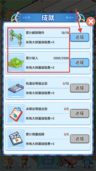 4、在成就界面,对已达成的成就点击【达成】,领取奖励以提升所有大桥基础收费。