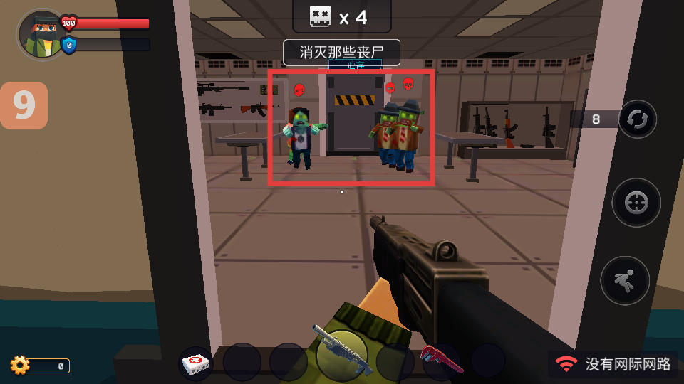4、遇到僵尸时,使用武器消灭它们,完成“消灭那些丧尸”的任务,获取游戏奖励并推进关卡。