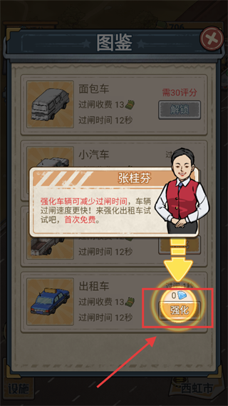 1、在图鉴中点击出租车的【强化】按钮,首次强化免费,可减少过闸时间,提升通行效率。