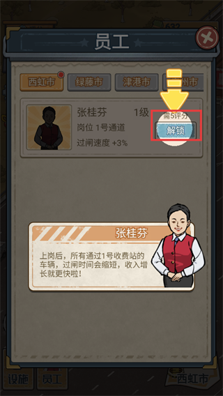 2、在员工界面点击【张桂芬】的【解锁】按钮,需5评分,解锁后提升1号通道过闸速度,增收更快。