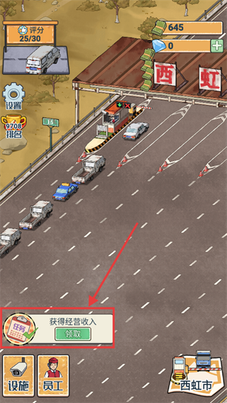 3、点击左下角【获得经营收入-领取】按钮,领取收益,积累资金用于升级设施、员工或强化车辆。