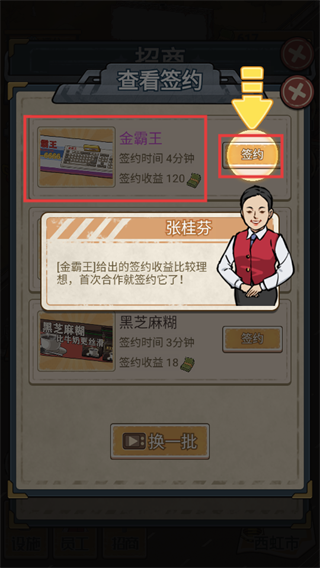 4、在招商界面点击【金霸王】的【签约】按钮,签约4分钟收益120,首次合作推荐签约,增加收益。