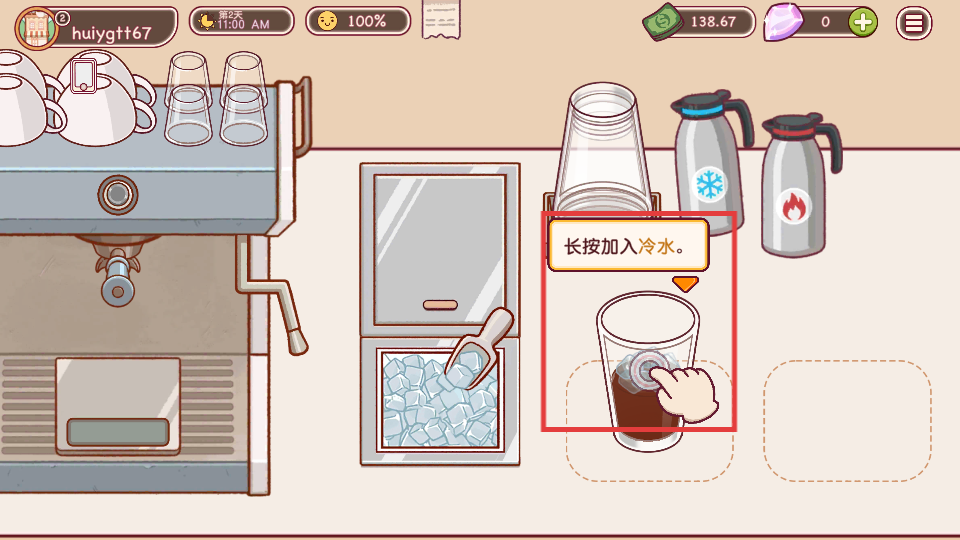 3、长按加入冷水,调配咖啡浓度,提升咖啡口感。