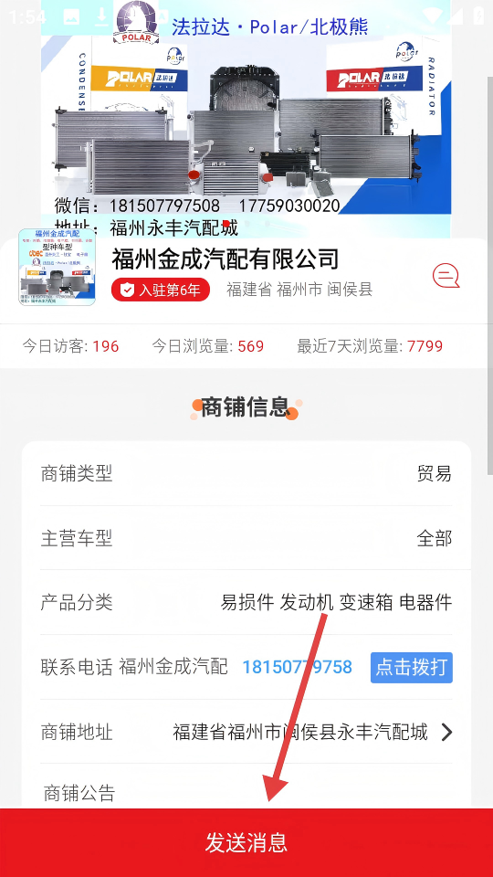 3、在【福州金成汽配有限公司】的商铺页面,点击【发送消息】可与该商家沟通。