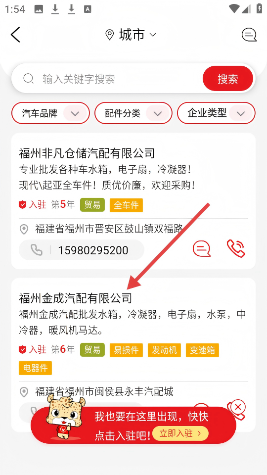 2、在搜索结果中找到【福州金成汽配有限公司】,可查看其经营的汽配产品等信息。
