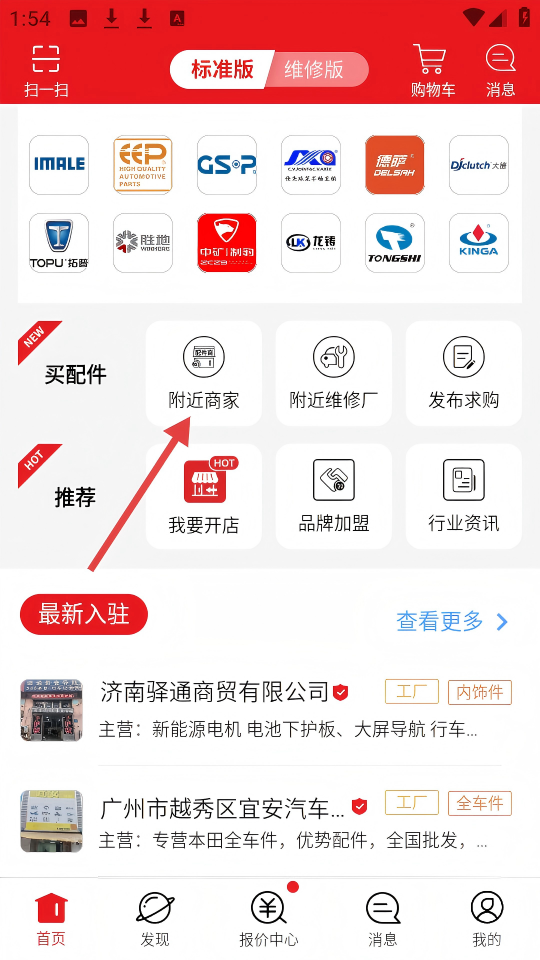 1、点击首页的【附近商家】,可查找周边的汽配商家。