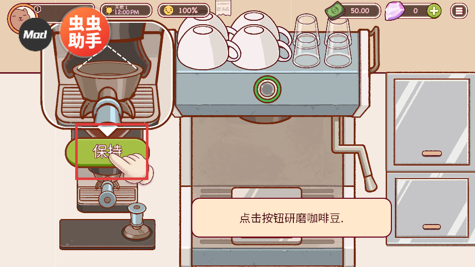 3、点击【保持】按钮,研磨咖啡豆,制作咖啡原料。