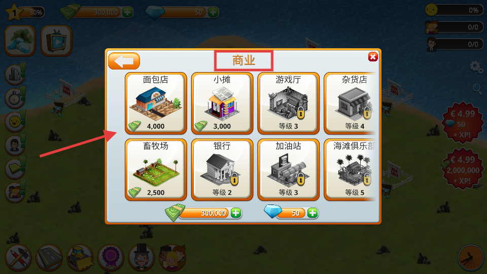 3、进入【商业】界面,优先选择低价设施如【面包店】建造,满足需求、增加收入。