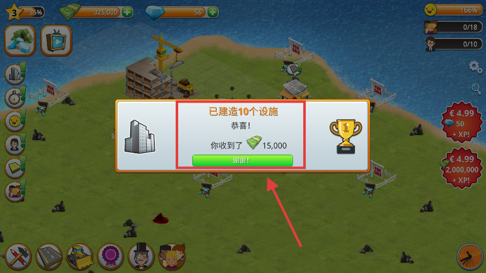 4、完成【已建造10个设施】任务,点击【谢谢】领取15000现金,用于后续城市建设。