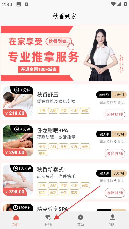 1、在【秋香到家】项目页面,点击底部【技师】选项,进入技师列表页面。