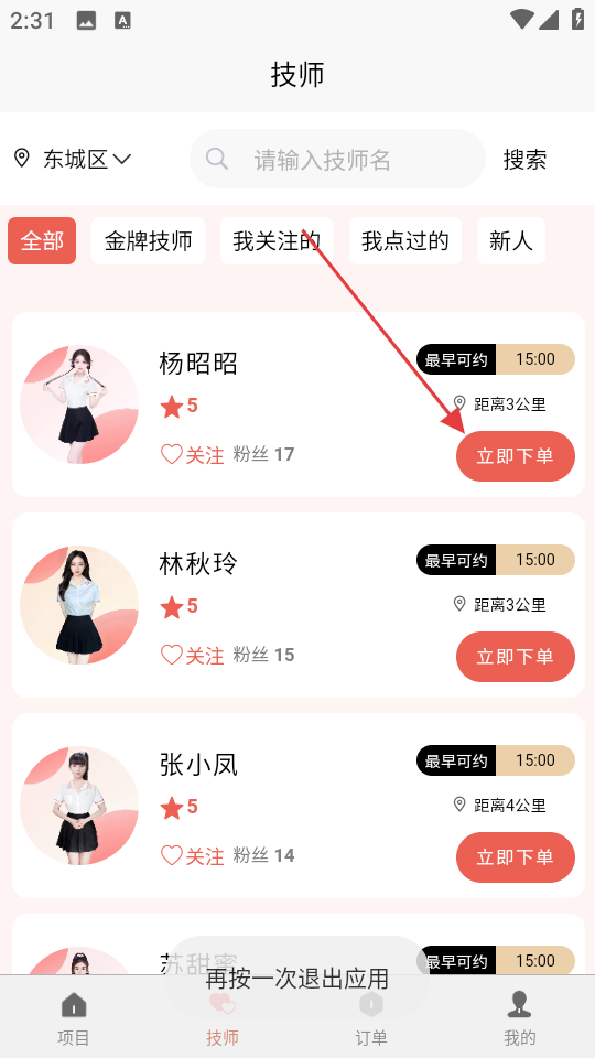 2、在技师列表页面,选择技师后点击【立即下单】,进入技师服务项目选择页。