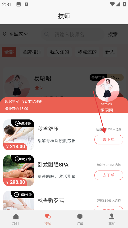 3、在技师服务项目选择页,点击对应服务的【去下单】,进入订单详情页。
