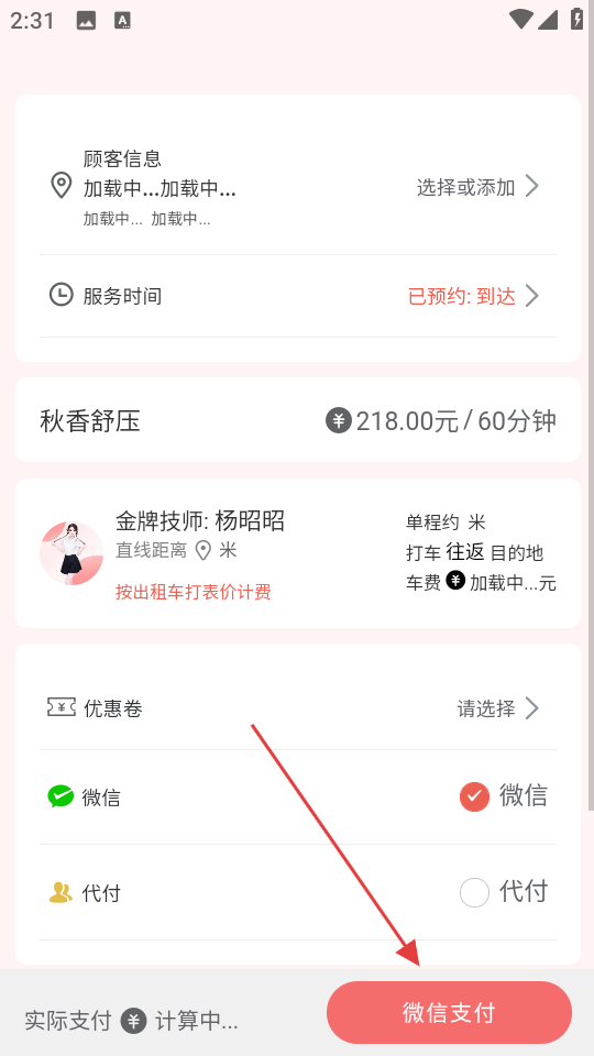 4、在订单详情页,确认信息后点击【微信支付】,完成推拿服务订单支付。