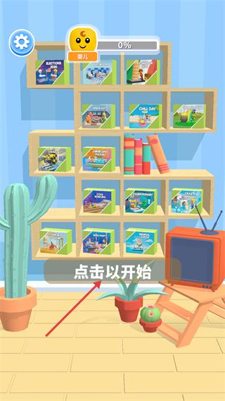 1、在初始界面点击【点击以开始】,进入包含书架、绿植等元素的场景,准备开启建造流程。