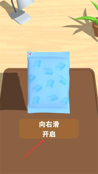 4、遇到包装类素材时,按照提示【向右滑开启】,滑动操作解锁新的积木组件用于建造。