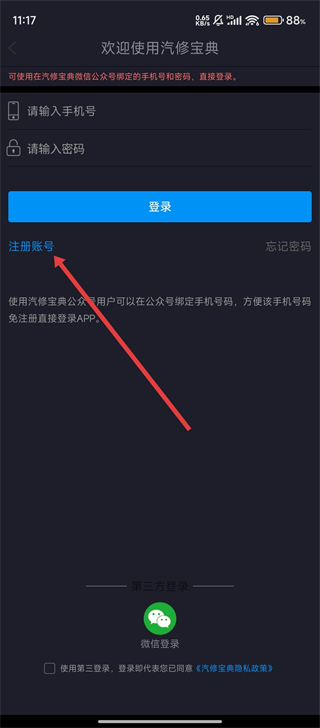 1、打开汽修宝典,在登录界面点击【注册账号】,开启账号注册流程哦。