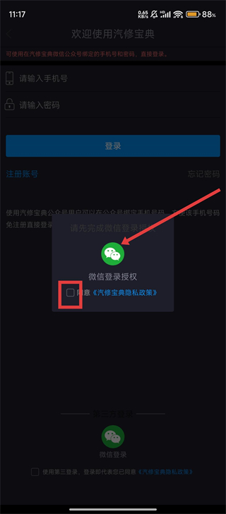 2、接着要先微信授权,勾选同意【汽修宝典隐私政策】,再点击【微信登录】授权就行啦。