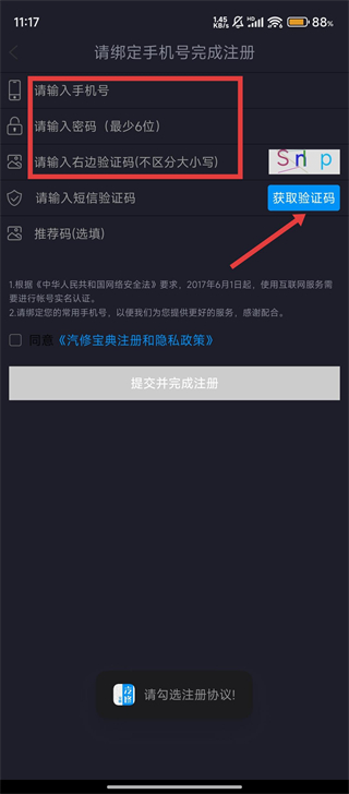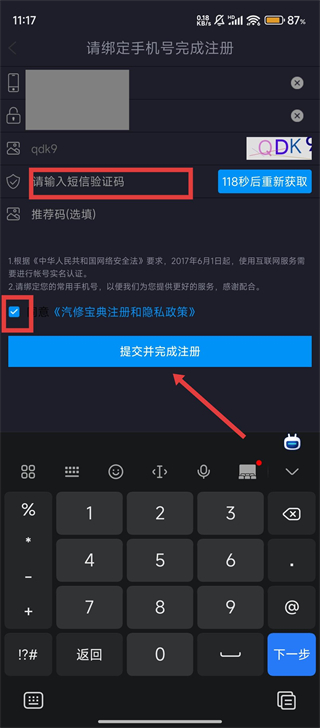 4、输入短信验证码,勾选同意注册协议,点击【提交并完成注册】,就能完成汽修宝典账号注册啦。