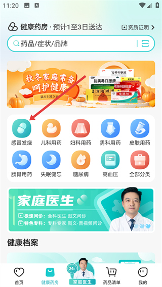 1、打开111医药馆,在健康药房页面点击【感冒发烧】分类,进入对应药品列表呢。