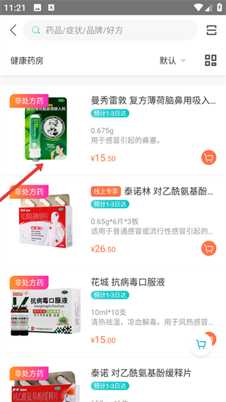 2、在健康药房页面,点击“感冒发烧”分类,进入感冒药品列表页面。