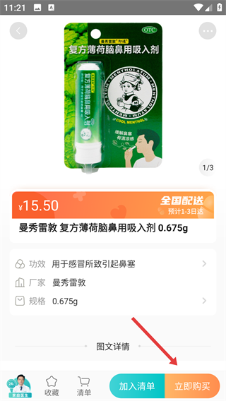 4、在药品详情页面,点击“立即购买”,即可发起该药品的购买流程。