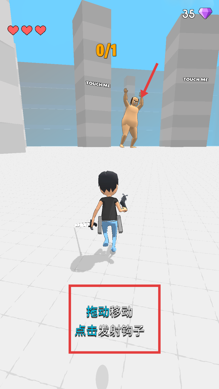1、通过【拖动移动】控制角色,【点击发射钩子】攻击目标。