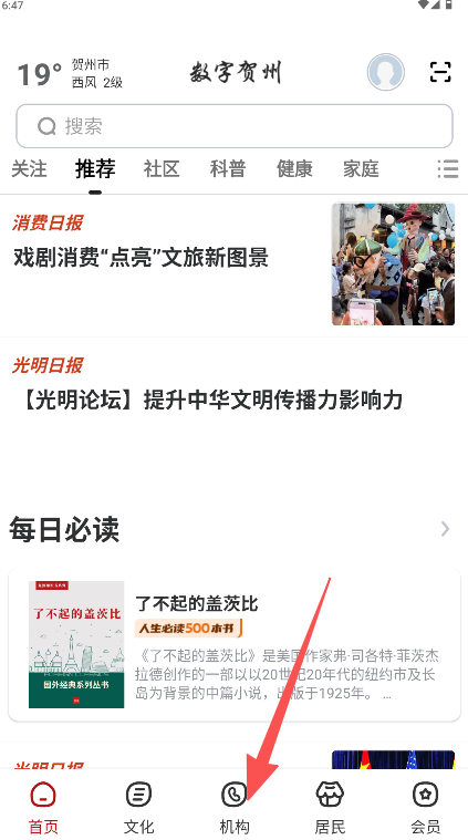 《数字贺州》是一款本土化资讯服务软件。界面顶部整合时间、天气、地点等实用信息,并设全局搜索栏。内容板块以关注、推荐、社区等标签分类,聚合消费日报、光明日报等权威媒体文章,涵盖文化、科普、健康多领域。每日必读板块推荐经典书籍。底部导航栏连通首页、文化、机构等本地服务入口。软件将垂直资讯与本地功能结合,结构清晰,为贺州居民提供一站式信息获取平台。