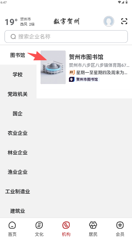 2、在机构页面左侧分类中选择“图书馆”类别,右侧将显示对应列表。