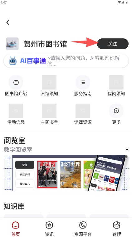 3、选择目标机构如“贺州市图书馆”,进入详情页即可关注。