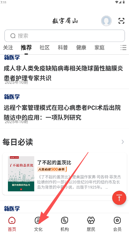 《数字眉山》是一款本土化综合信息平台。界面顶部设搜索栏,下方以关注、推荐、社区等标签分类内容。推荐流聚合科学24小时、美食等多元媒体文章,涵盖科普、健康、家庭多领域。底部导航栏连通文化、机构、居民等本地服务入口。软件将垂直领域资讯与本地生活服务结合,结构清晰,内容覆盖广泛,为眉山居民提供一站式信息获取与生活服务平台。