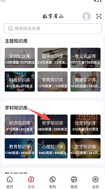 2、在文化页面选择“学科知识库”浏览并点击目标知识库如“哲学知识库”。