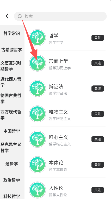 3、进入哲学知识库页面,可在左侧选择细分分类,右侧查看具体词条并点击“关注”按钮。
