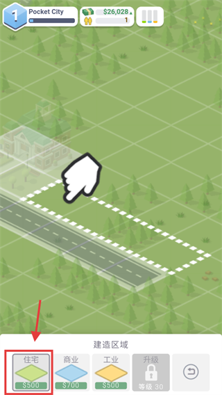 3、点击【住宅】选项(花费【$500】),在道路旁建造区域规划住宅区,完善居住空间。