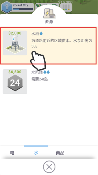 4、点击建造【水塔】(花费【$2,000】),为道路附近区域供水,水泵距离为【50】。